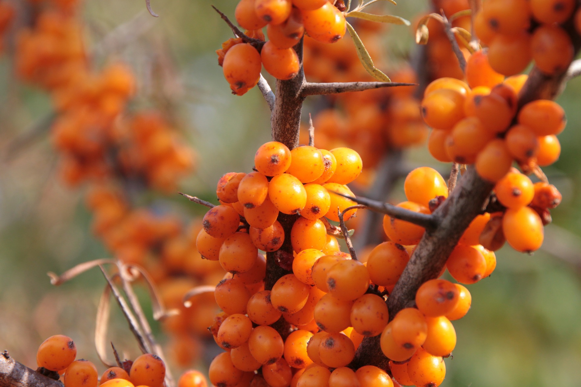 Obwohl der Sanddorn mittlerweile auch in Mitteleuropa heimisch ist, stammt er ursprünglich aus Asien. Sein Kennzeichen sind die vielen Dornen und die orangeroten Früchte. Letztere enthalten mehr Vitamin C als eine vergleichbare Menge Zitronen. Allerdings sind die Sanddornbeeren sehr sauer und herb, weswegen sie roh nicht besonders schmackhaft sind. Man kann aus ihnen aber sehr gut Brotaufstriche machen und auch ihr Saft ist beliebt.
