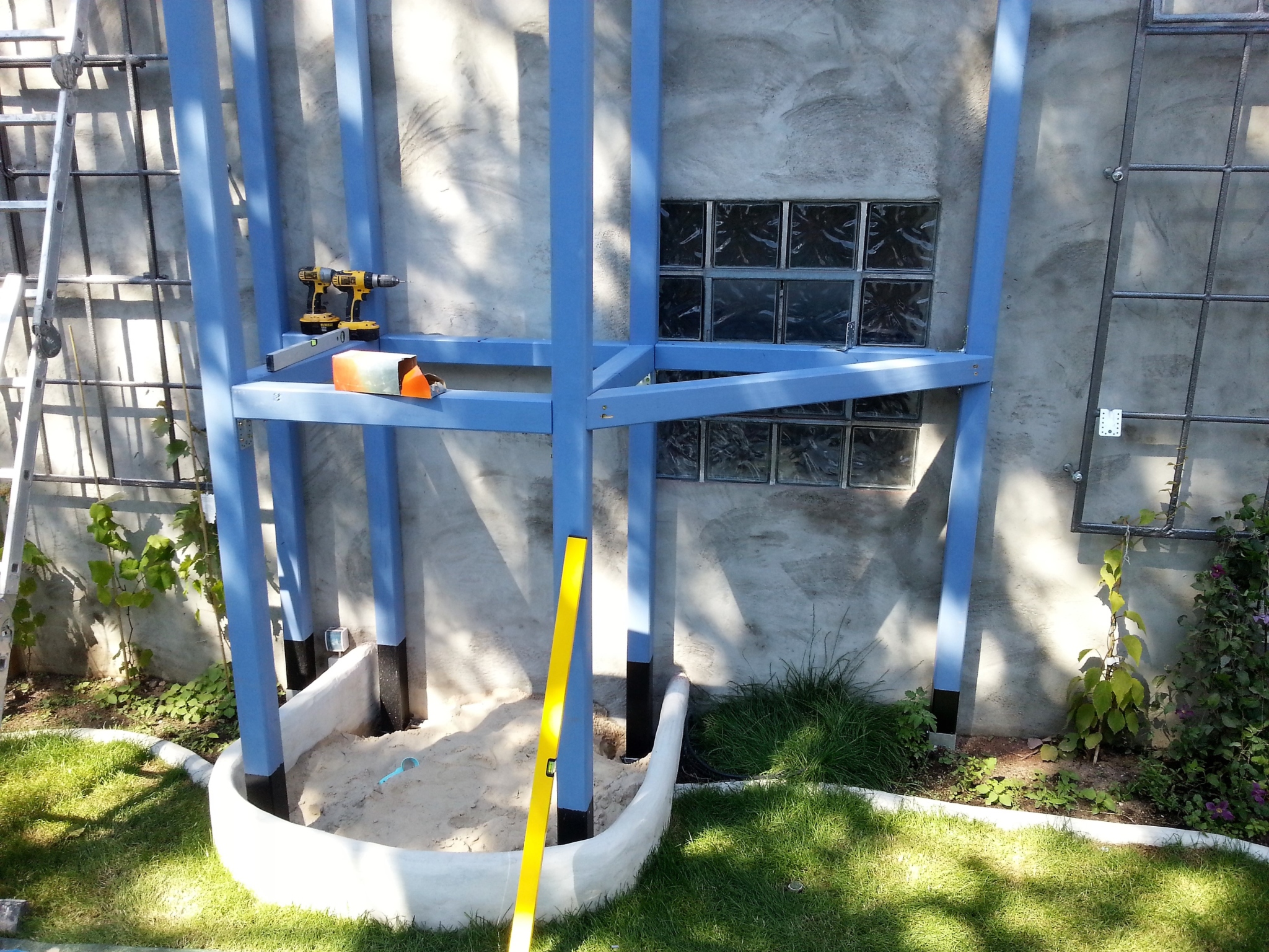 Nachdem aus dem Holzhaufen ein bunter Holzhaufen geworden war, machen wir uns an den Aufbau des Piratenstrandhauses. Hierzu wurden zunächst die wandseitigen Posten auf Länge gekürzt und in die vorhandenen Bodenanker gesteckt. Im Anschluss konnten wir die Bohrpunkte für die Wandhalter anzeichnen und mit dem Bohrhammer entsprechend in die Grenzwand bohren. Da es sich um eine alte Klinkerwand handelt, mussten wir die zugehörigen Dübel mit Montagemörtel einsetzen, bevor Wandhalter, Wand, Pfosten und Bodenanker miteinander verschraubt werden konnten.